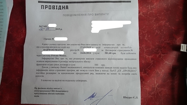 Спустя неделю пришло письмо следующего содержания: принято положительное решение о выплате страхового возмещения. Но при этом "Провидна" начислила на ремонт авто 1080 грн, что без учета франшизы чистыми составляло 580 грн. Фактически компания предложила отремонтировать треснутый в нескольких местах бампер, перекрасить его, заменить порванный брызговик и выровнять погнутую выхлопную трубу (на фото их не видно) за деньги, которых едва хватило бы даже на пайку пластика.