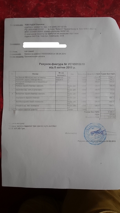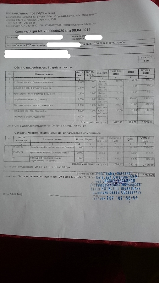 Итог оказался вполне прогнозируемым: официальный сервис насчитал сумму около 4 тыс. грн. И даже если отнять все "накрутки" авторизированного СТО, а также НДС, размер выплаты составил бы около 3 тыс. грн, но уж никак не 1080 гривен. Дабы не тянуть время, полученную калькуляцию сразу же отвезли в "Провидну" и написали заявление, чтобы заключение СТО приняли к сведению.