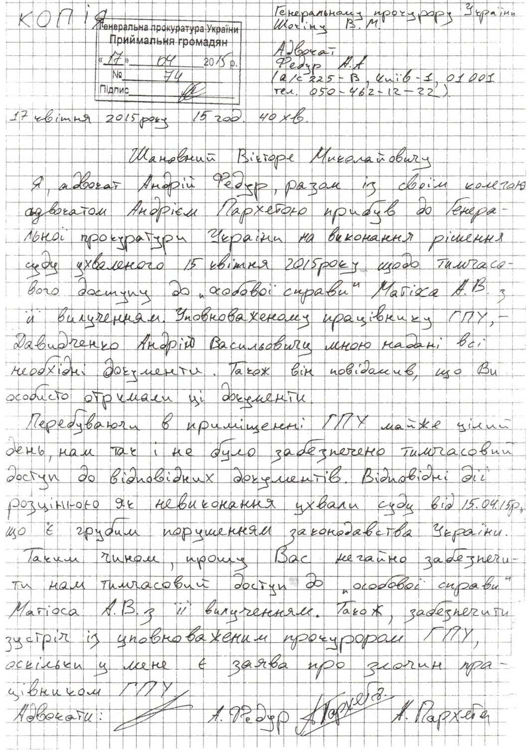 17 апреля адвокатыА.Федур и А.Пархетаприбыли в Генеральную прокуратуру с решением суда о предоставлении временного доступа к документам - личному делу заместителя Матиос.