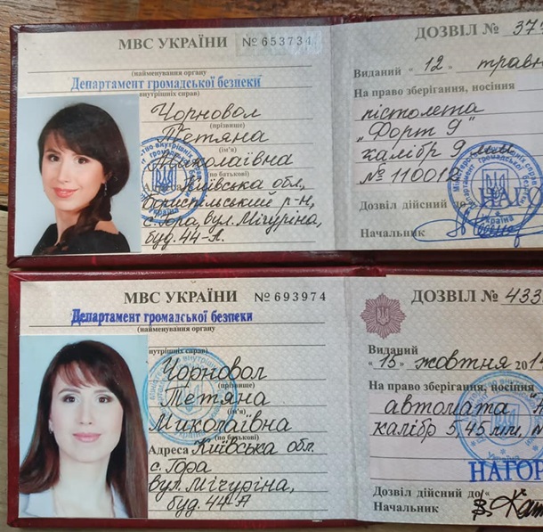 Также она обнародовала фотографии постановления суда и самих удостоверений. В постановлении отмечается, что суд принял решение предоставить следователям временный доступ к вещам и документам, которые находятся во владении Чорновол, "а именно: к оригиналу разрешения №4333, выданного 15 октября 2014 года на имя Татьяны Чорновол, на право хранения, ношения автомата АКС-74 калибром 5, 45 мм №63 74003-89 (бланк удостоверения №693974), а также – к оригиналу разрешения № 3776, выданного 12 мая 2014 года на имя Татьяны Чорновол, на право хранения, ношения пистолета Форт 9 калибром 9 мм, №110012 (бланк удостоверения № 653734).