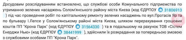 До речі, це комунальне підприємство фігурує у кримінальній справі, датованій 2015 роком. Як встановили слідчі, службові особи КП УЗН Солом’янського району міста Києва під час проведення робіт з капремонту зелених насаджень по вул. Протасів Яр та по бульвару І. Лепсе розкрадали кошти шляхом їхнього перерахування ПП «Крона Парк» та ТОВ «Сістем Енерджи Нью». Розкрадання здійснили за попередньою змовою зі службовими особами ПП «Крона Парк».