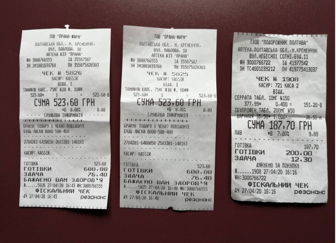 Также он показал чеки на покупку лекарств на общую сумму в 1329 грн.
