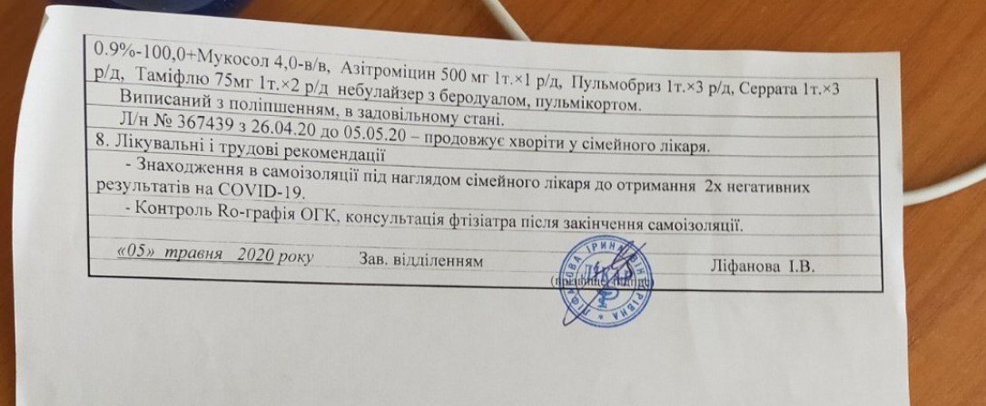 "Нам только пробиотик давали бесплатно, это чтобы лекарства на желудок не воздействовали. А "Тамифлю", "Серрата", все остальное покупается за деньги… "Левофлоксацин" давали бесплатно, это капельница, еще глюкоза была бесплатная, тоже капельница. А дальше все за мои деньги – "Серрата" платная, "Пульмобриз" платный, "Тамифлю" тоже платное. "Азитромицин" тоже платный", – рассказал он.