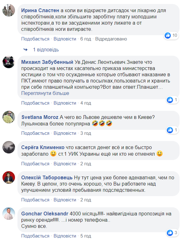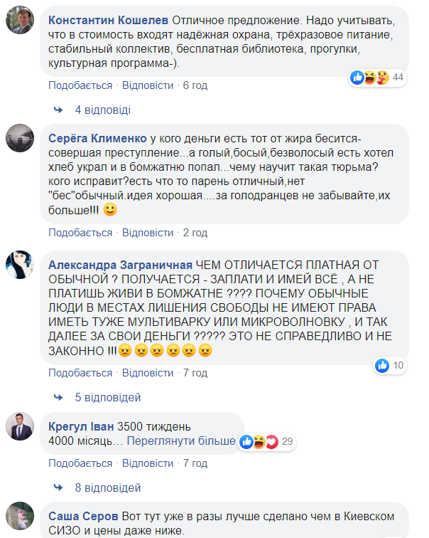 "Отличное предложение. Надо учитывать, что в стоимость входят надежная охрана, трехразовое питание, стабильный коллектив, бесплатная библиотека, прогулки, культурная программа", "Вот тут уже в разы лучше сделано, чем в Киевском СИЗО и цены даже ниже", "А чего во Львове дешевле чем в Киеве? Лукьяновка более популярна", "Подскажите, почему в Киеве 12 000 стоит эта услуга, а во Львове 4000? Калькуляция не понятна", "Если эти деньги пойдут на ремонт и благоустройства СИЗО, почему бы и нет", "Санаторий", – комментируют подписчики.
