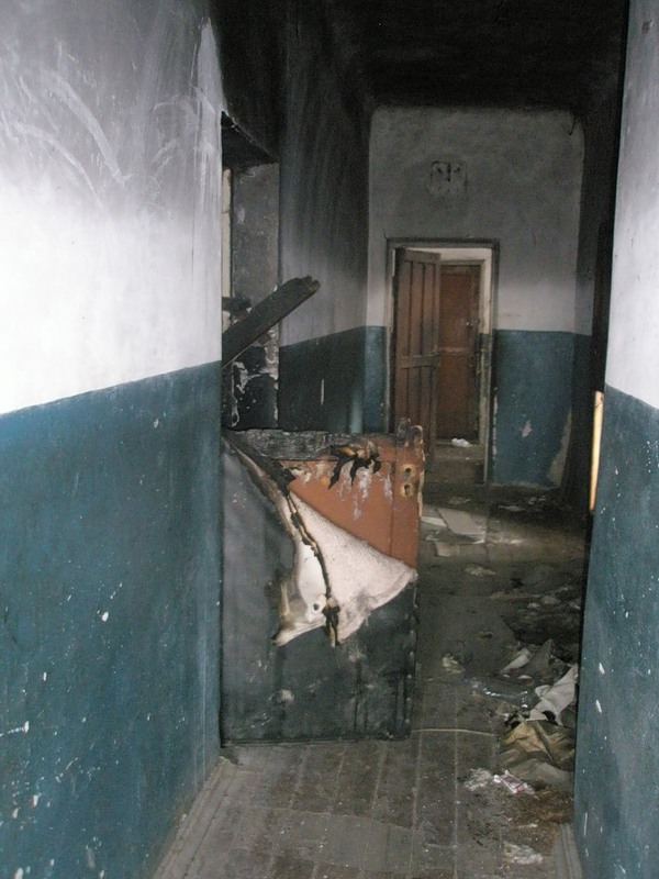В боковых квартирах такого трэша не было, и мы решили их изучить. Тут, судя по копоти на потолке, произошел пожар. От одной из дверей остались лишь обугленные останки. Удивительно, как после такого не сгорел весь барак.