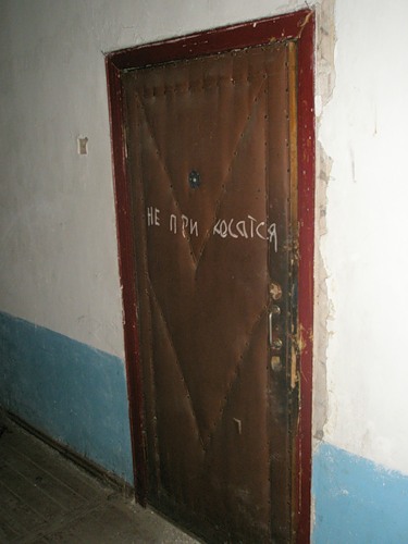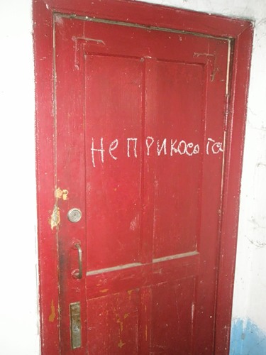 Большинство квартир были заперты и пусты, но хозяева у них скорее всего имеются, о чем говорят угрожающие надписи на дверях. Подобное я видел в фотоотчете из покинутого города Кадыкчан в Магаданской области России. Там оставшиеся жильцы тоже наносили похожие надписи на свои двери, чтобы уберечь квартиры от разграбления.