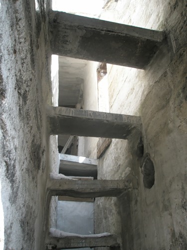 Посередине дом имеет некую выемку с чем-то вроде ступеней, которые ведут на крышу (зачем?) Назначение этой выемки осталось для нас загадкой.