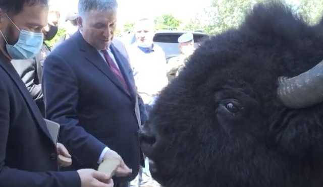 "Контур территории охраняется Нацгвардией. Внутри контура, меж обьектами - в лесопарке живут олени и бизоны! И вот бизон с бизонихой и бизнятами, увидев какой-то нестандартный беспорядок - притопали разбираться к шумящей столичной делегации! Откупились от неприятностей хлебушком, добрым словом и обещанием зачислить на довольствие в Нацгвардию!" - пошутил Арсен Аваков.