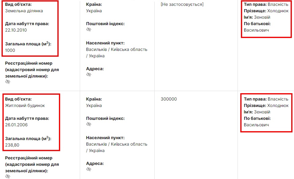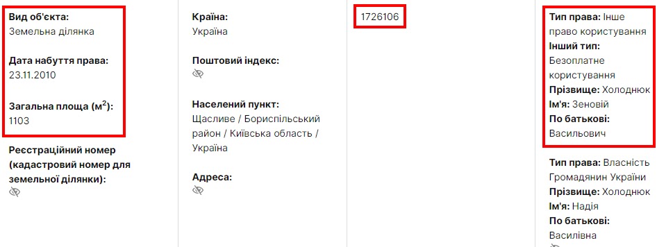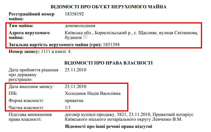 Немного больший участок Холоднюк имеет в Бориспольском районе - 11 соток. Правда, записан он не на него, а на некую Холоднюк Надежду Васильевну. Мы догадываемся, что это сестра. Ранее она жила в соседней квартире с Зеновием Холоднюком, работала в «ВиЭйБи Банк» и бизнеса не имела. Однако смогла обзавестись участком стоимостью в 1,72 млн грн.