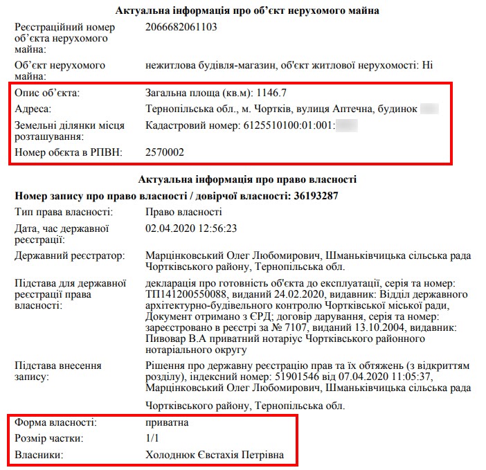Если же верить Википедии, у Зиновия Васильевича есть мать - Холоднюк Евстахия Павловна, или Петровна с прекращенным предпринимательским профилем. Она родом с Тернопольщины, из г. Чертков. Во время карантина зарегистрировала там нежилое здание-магазин площадью 1146.7 кв. м. Мы не в состоянии даже приблизительно определить стоимость такого имущества, но, очевидно, оно недешевое, если учесть, что расположено в центральной части города областного значения.