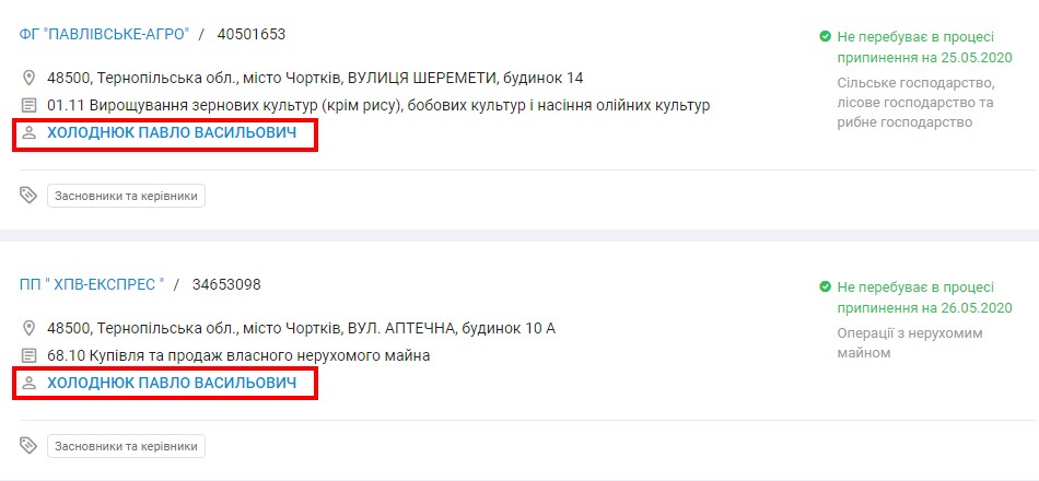 Там уже зарегистрированы два предприятия и одна партийная организация. Среди них ООО "ХПВ-ЭКСПРЕСС" Холоднюка Павла Васильевича, вероятно - брата председателя ГСА. Фирма занимается покупкой и продажей недвижимости. Павел Васильевич - местный бизнесмен и кандидат в народные депутаты. Сейчас возглавляет тернопольской центр Крестьянской партии. В 2016-м основал фермерское хозяйство «Павловское Агро», которое не подает признаков прибыльного предприятия.