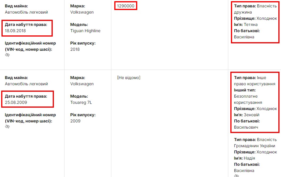 С 2009 года в пользовании Зиновия Васильевича находится автомобиль Volkswagen Touareg 7L, принадлежащий Надежде Холоднюк. Транспорт не вносился в более ранние декларации. Жена Татьяна Холоднюк недавно стала собственником Volkswagen Tiguan, приобретенным за 1,29 млн грн, что в разы превышает ее годовую заработную плату.