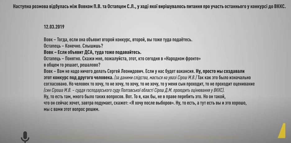 Взамен Холоднюк обеспечил избрание двух новых членов ВККС. Правда, для этого пришлось досрочно уволить членов ВККС Тараса Лукаша и Станислава Щотку. Новыми членами Холоднюк назначил Сергея Остапца и Андрея Солодкова. На пленках НАБУ четко зафиксировано, как Остапец договаривается с Вовком об этом посте.