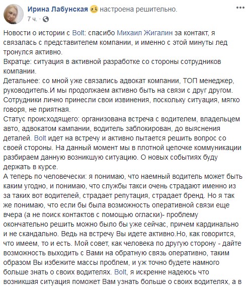 Пострадавшая Ирина Лабунская, вещи которой украл таксист, написала в Facebook, что с ней связались работники такси. Они пошли на встречу и также пытаются решить проблему. Она выразила надежду, что подобное ЧП научит компанию более детально узнавать о водителях, которых берут на работу.