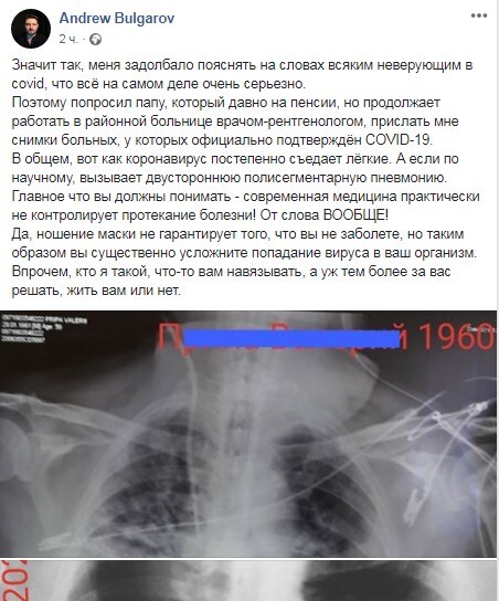 "Меня задолбало пояснять на словах всяким неверующим в COVID-19, что все на самом деле очень серьезно. Поэтому попросил папу, который давно на пенсии, но продолжает работать в районной больнице врачом-рентгенологом, прислать мне снимки больных, у которых официально подтверждён COVID-19. В общем, вот как коронавирус постепенно съедает легкие. А если по научному, вызывает двустороннюю полисегментарную пневмонию", – пояснил написал Булгаров.