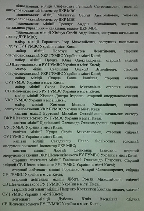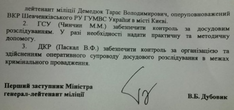 Согласно документу, в МВД была создана группа оперативников, которая занималась делом против майдановцев. При этом на Паскала была возложена обязанность "обеспечить контроль за организацией и осуществлением оперативного сопровождения досудебного расследования в пределах уголовного производства".