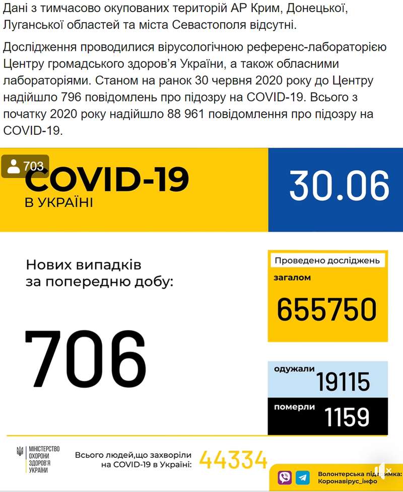 "30 июня (по состоянию на 9:00) в Украине 44 334 лабораторно подтвержденных случая COVID-19, из них 1159 летальных, 19115 пациентов выздоровели. За сутки зафиксировано 706 новых случаев. Всего проведено 655 750 тестирований методом ПЦР", – говорится в посте.