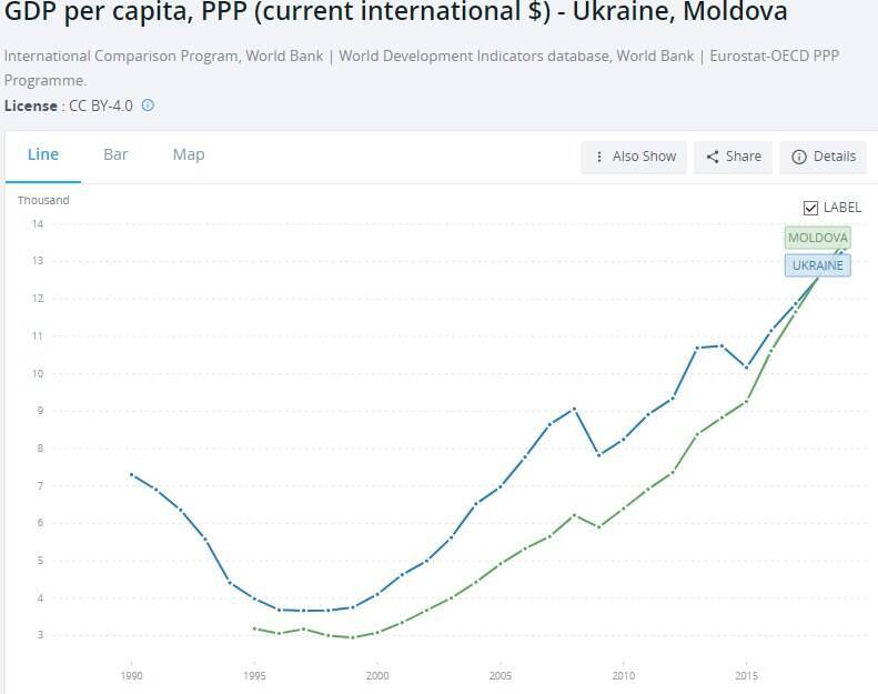 ВВП на душу населения с учетом ППС в постоянных ценах 2017 года: Украина $12 810; Молдова $13 034