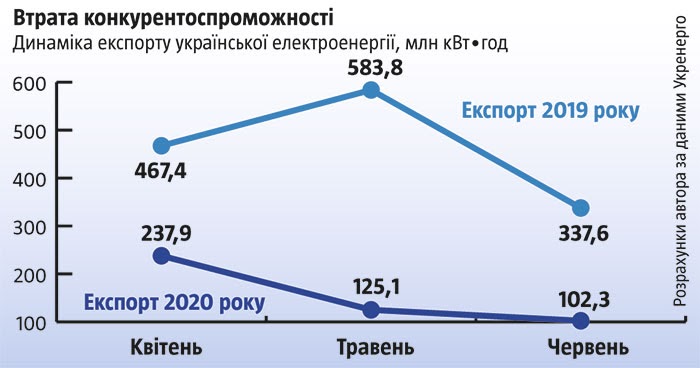 В то же время вследствие преференций энергомонополии олигарха, что привело к резкому завышению цен на внутреннем рынке страны, украинская электроэнергия закономерно полностью утратила конкурентоспособность на рынках всех соседних европейских стран, в которых ее недавно поставляли в значительных объемах (см. «Потеря конкурентоспособности»). Если в прошлом году в мае - июне ежемесячные объемы экспорта электроэнергии достигали 580 и 340 млн кВт•ч соответственно, то в мае - июне 2020-го уменьшились до 125-100 млн кВт•ч.