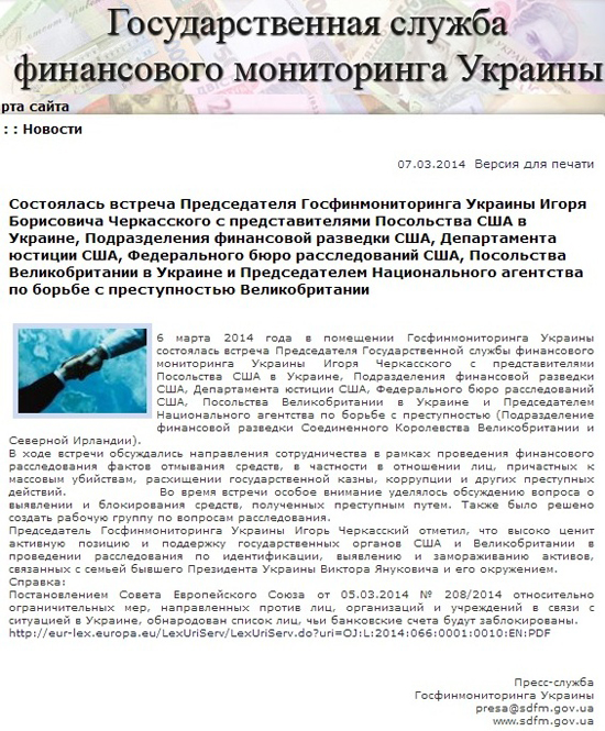 Еще 6 марта Государственная служба финансового мониторинга Украины (финразведка) совместно с ФБР, финразведкой США и Великобритании, а также при участии посольств этих стран создали рабочую группу, которая будет расследовать факты отмывания денег. В том числе лицами, причастными к массовым убийствам, коррупции и расхищению бюджетных денег.