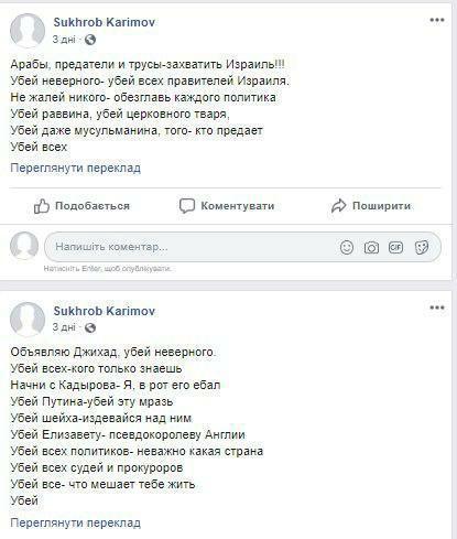 Добавим, что уроженец Узбекистана Сухроб Каримов на своей странице в Facebook призвал "убить всех". Посты, содержащие призыв к насилию, появились три дня назад.
