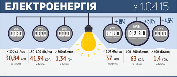 Платіжки, що споживачі отримають у травні, також міститимуть інші цифри: за споживання світла обсягом менше 100 кВт-год на місяць доведеться платити 37 коп/кВт-годину; обсягом від 100 до 600 кВт-год – 63 коп/кВт-год; обсягом понад 600 кВт-год на місяць – до 1,4 грн/кВт-год.