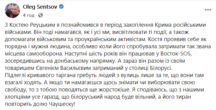 Сенцов отметил, что, в частности, с Константином Реуцким познакомился еще в период захвата Крыма российскими войсками. Тогда он тоже пытался освещать те события, а также помогать военным и проукраинским активистам. Константин, добавил режиссер, "проявил себя как порядочный и мужественный человек, особенно, когда его попыталась задержать так называемая местная самооборона". Тогда как следующие шесть лет он работал в "Восток-SOS", сосредоточившись на донбасском направлении.