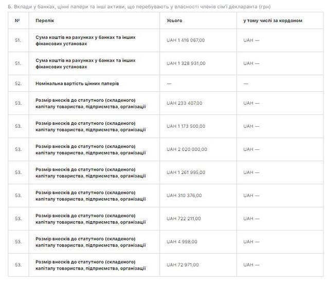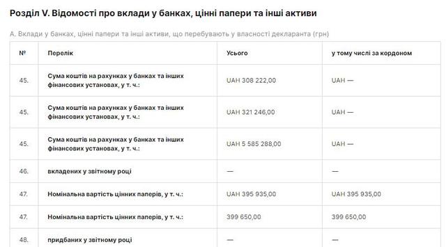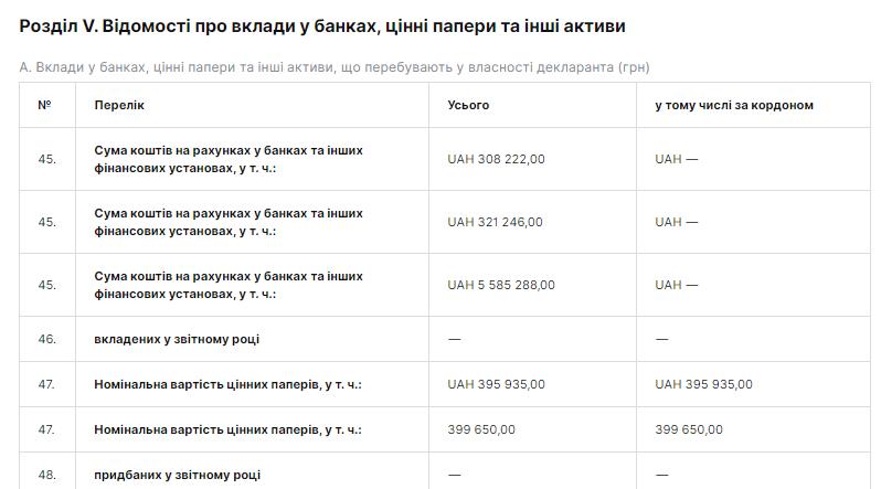 В декларации за 2014 год есть информация о его личных вкладах в банки, ценные бумаги и другие активы, как в Украине, так и заграницей.