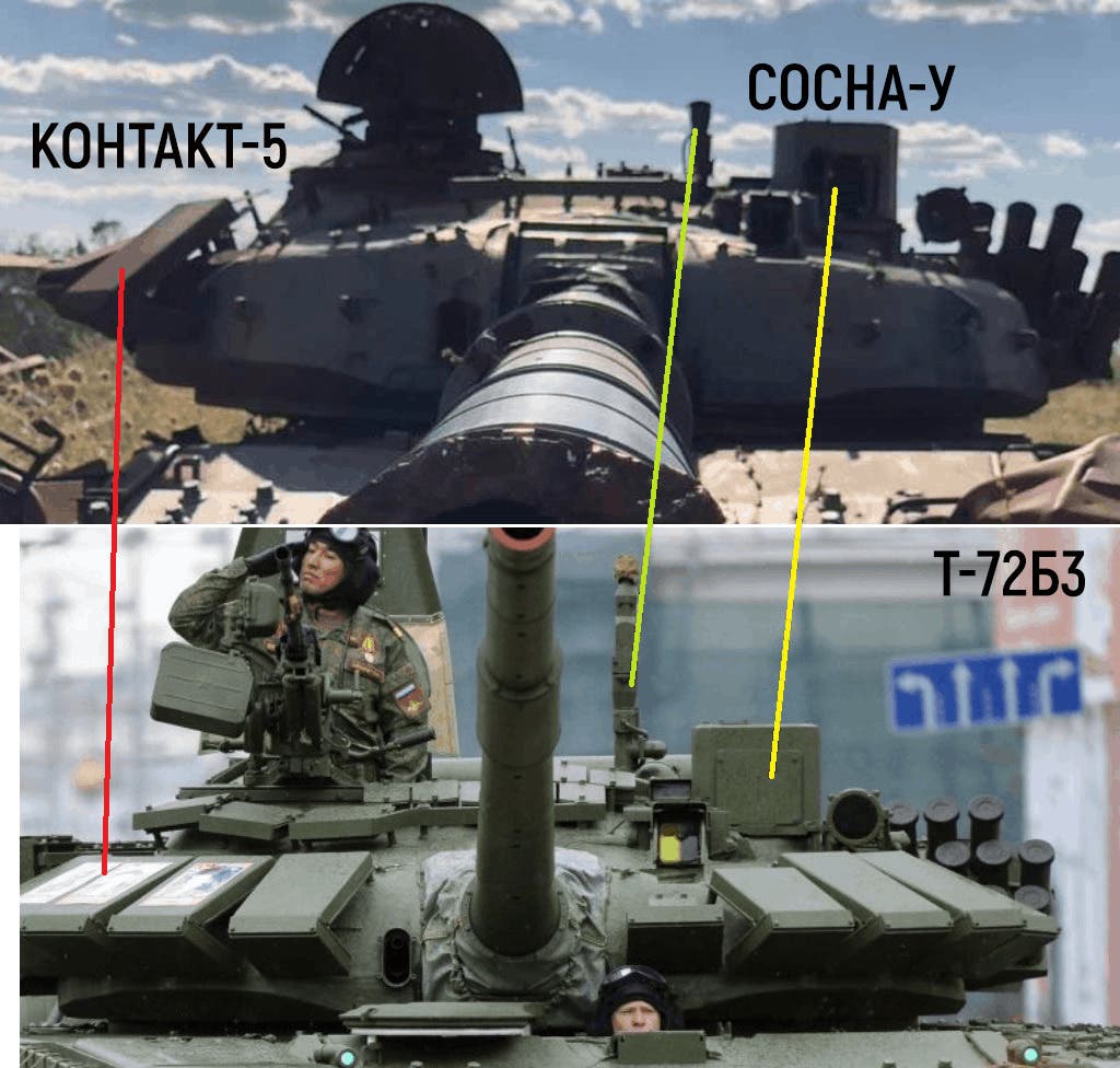 Еще возможно узнать уничтоженный современный танк армии РФ модели Т-72Б3. На вооружении он с 2013 года. Его отличает наличие динамической защиты Контакт-5, датчика ветра и современного прицела Сосна-У. Все это есть на фотографии уничтоженного танка в Ростовской области.