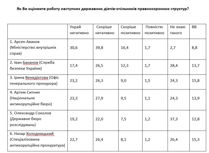 Зокрема, баланс позитивної/негативної оцінки діяльності міністра внутрішніх справ Арсена Авакова становить -52%, директора Національного антикорупційного бюро Артема Ситника – -41%, керівника Спеціалізованої антикорупційної прокуратури Назара Холодницького – -40%, Генеральної прокурорки Ірини Венедіктової – -39%, в.о. голови Державного бюро розслідувань Олександра Соколова – -33%, голови Служби безпеки Івана Баканова – -30%”