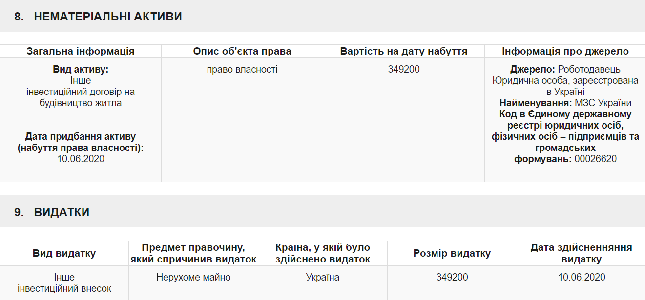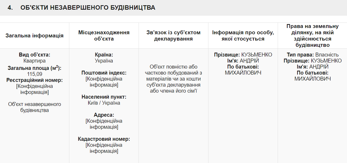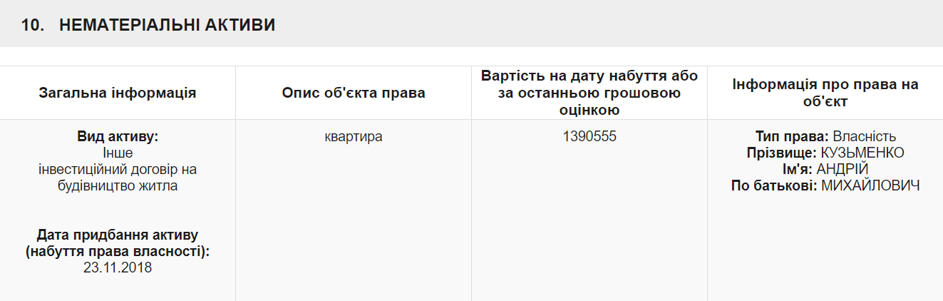 16 вересня Кузьменко задекларував право власності – інвестиційний договір на будівництво житла в Україні на суму 447 тисяч 554 гривні.