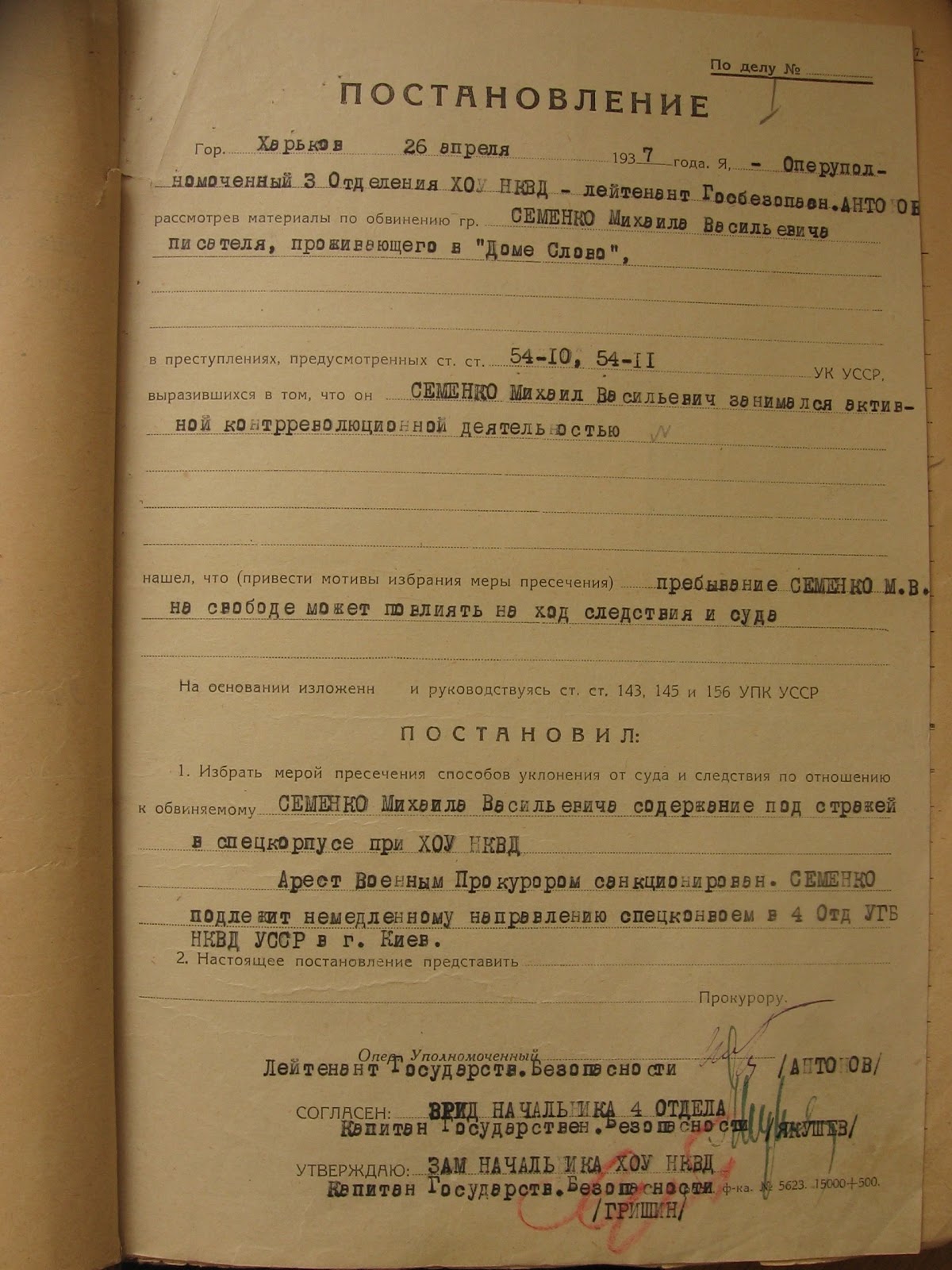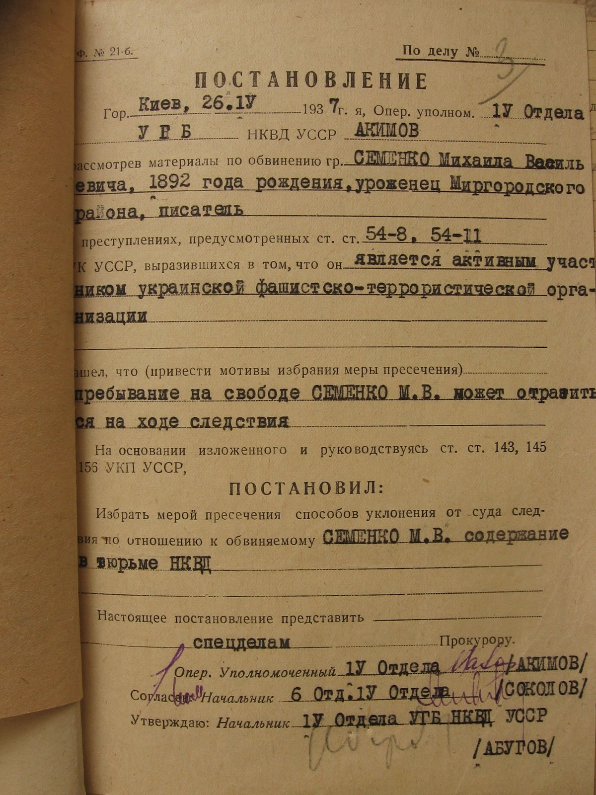 Михайль Семенко жил в Харькове, но часто наведывался в Киев, поэтому было выдано два постановления на его арест: Харьковского облуправления НКВД УССР от 26 апреля 1937 года и Управления Госбезопасности НКВД СССР от 25 апреля 1937 года. Писателя-футуриста обвинили в том, что он якобы является активным участником украинской фашистской террористической организации.