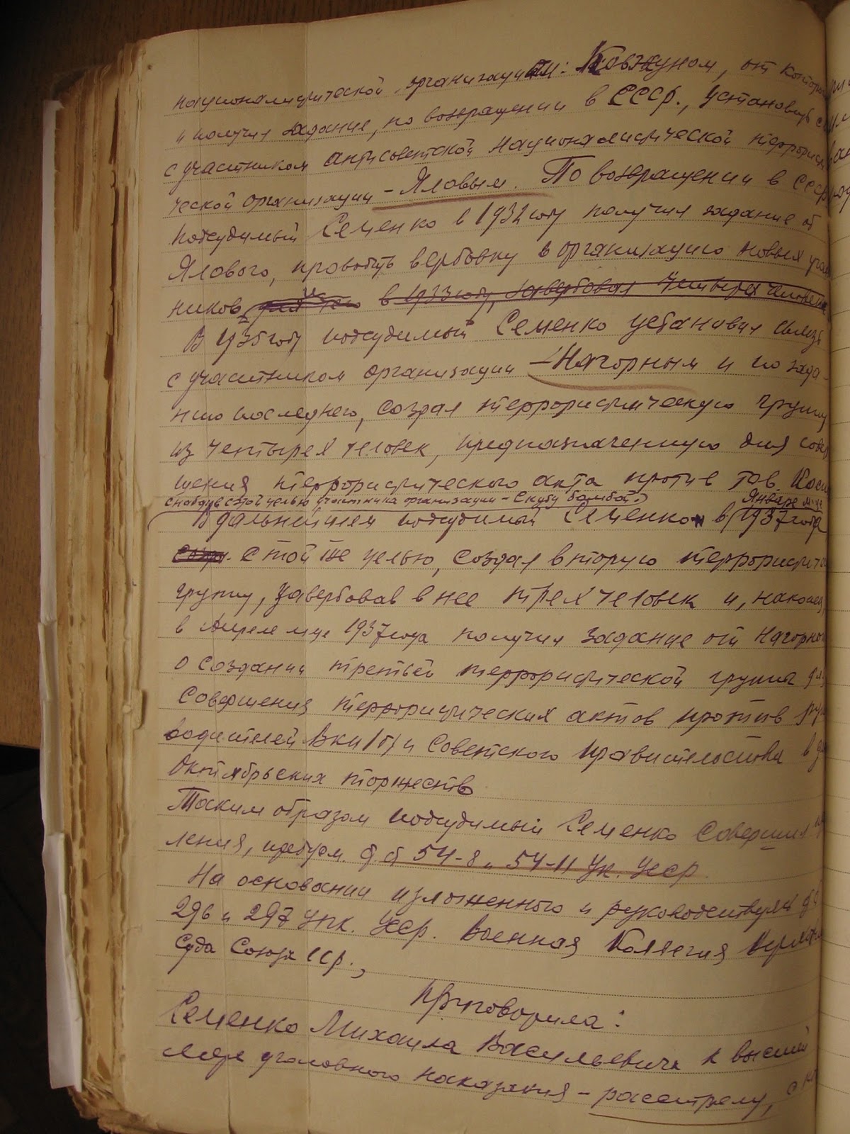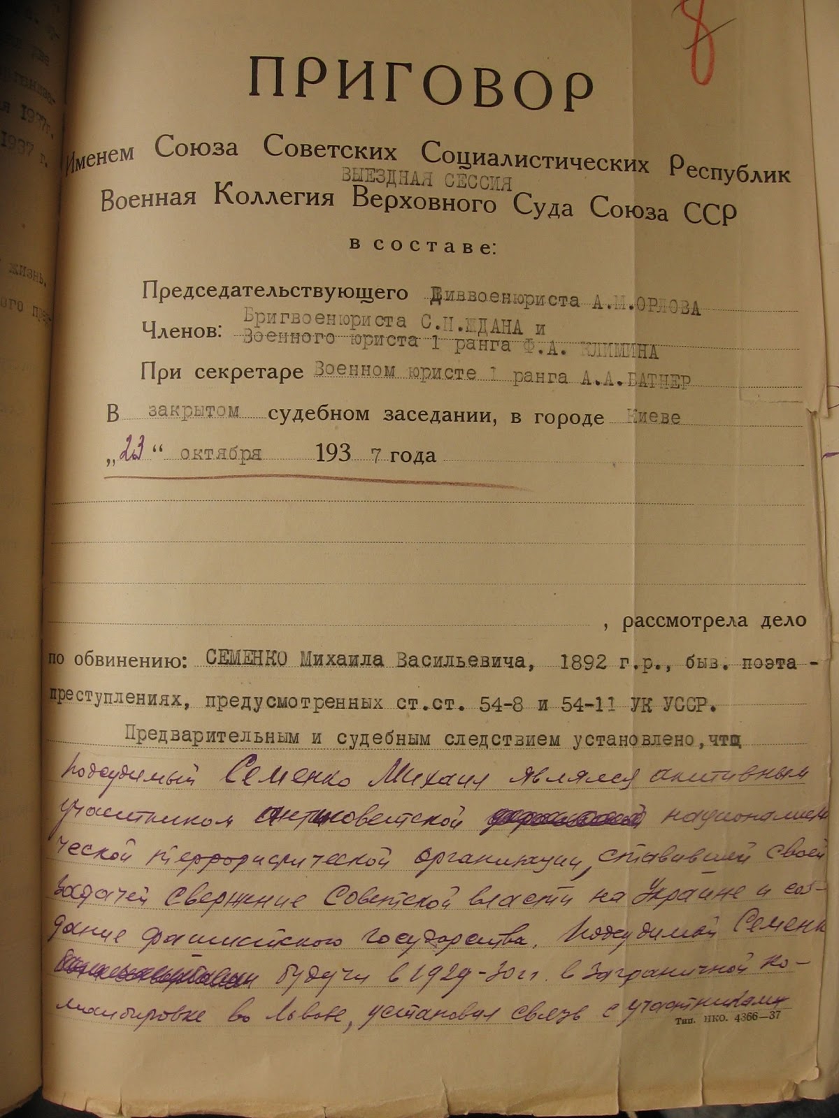 Косиора, снабдив в этой целью участника организации Скубу бомбой. ... В феврале м-це 1937 года получил задание от Нагорного о создании третьей террористической группы для совершения террористических актов против руководителей ВКП(б) и Советского правительства в день октябрських торжеств ... Военная Коллегия Верховного суда Союза ССР приговорила Семенко Михаила Васильевича к высшей мере уголовного наказания ─ расстрелу, с конфискацией всего, лично ему принадлежащего имущества».