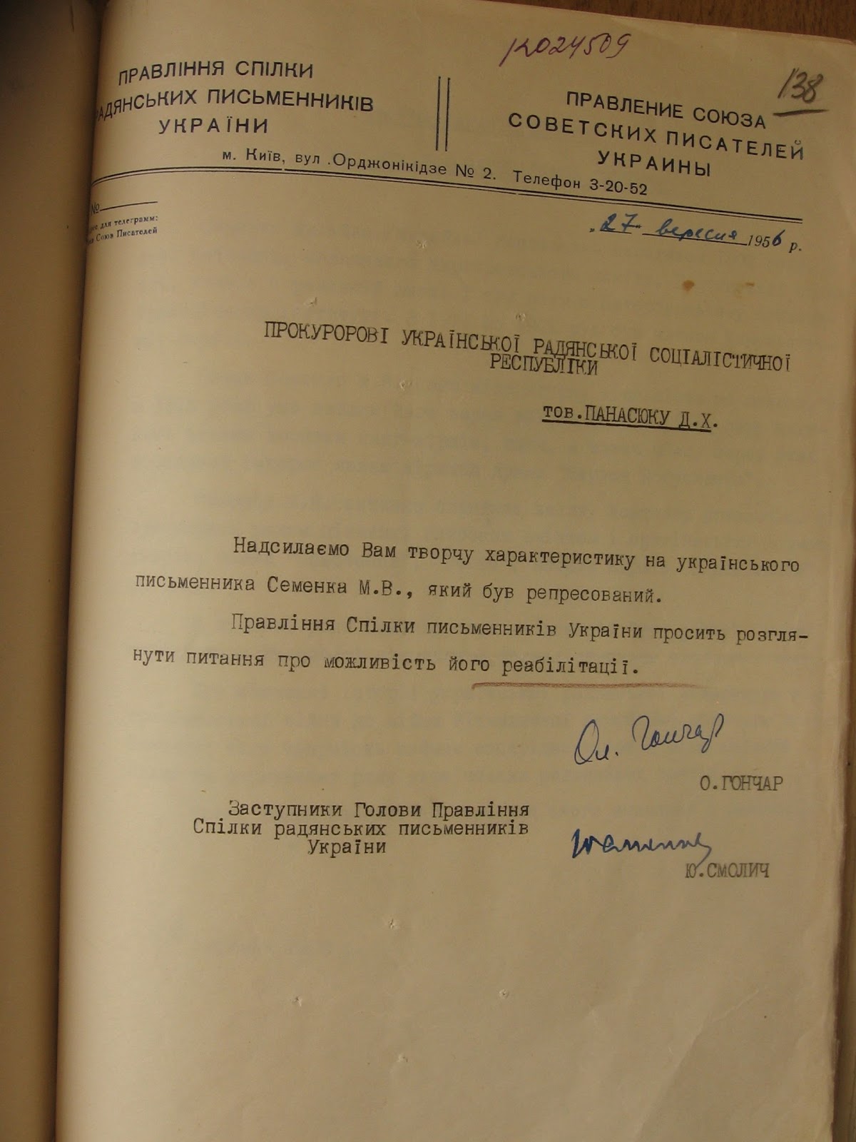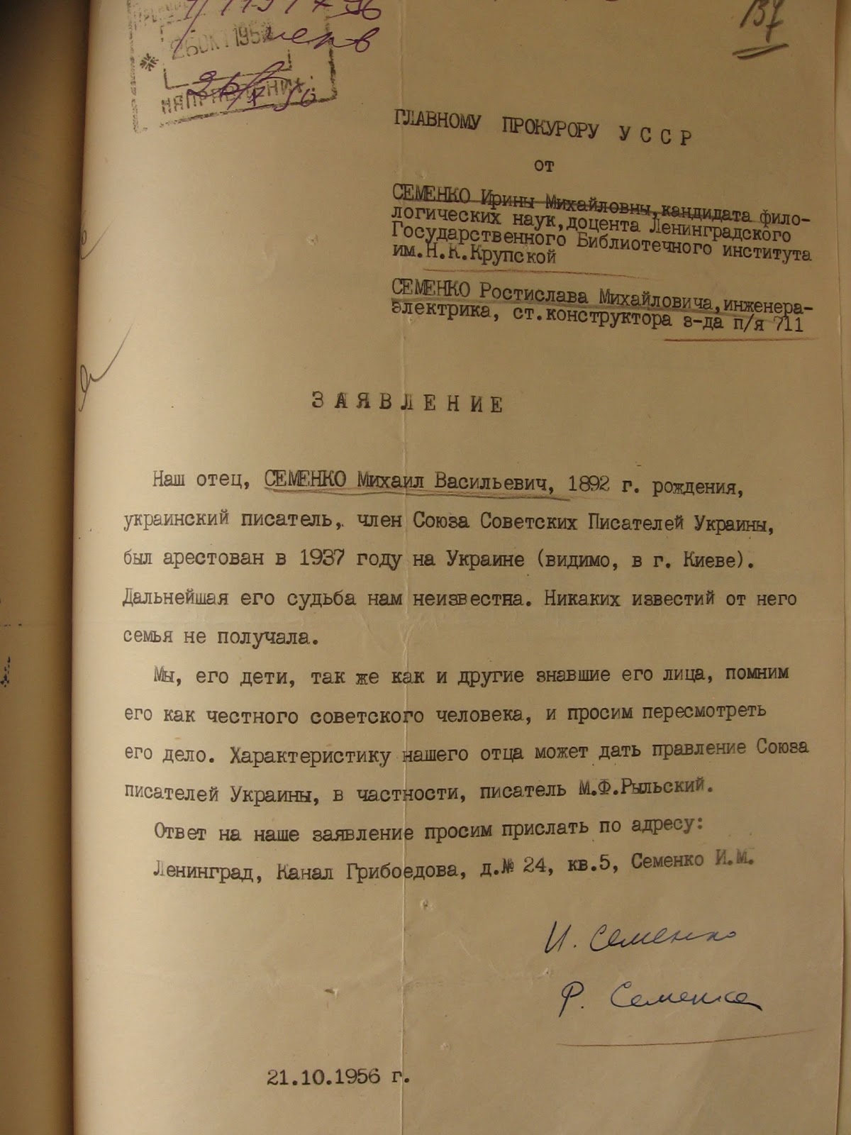 Заявление от детей Семенко на имя главного прокурора УССР и запрос от Союза писателей Украины о реабилитации Семенко. Сообщение от сына Ростислава Семенко о реабилитации отца, а также сообщение из архива КГБ, которое показывает, что Семенко не принадлежал к террористической организации