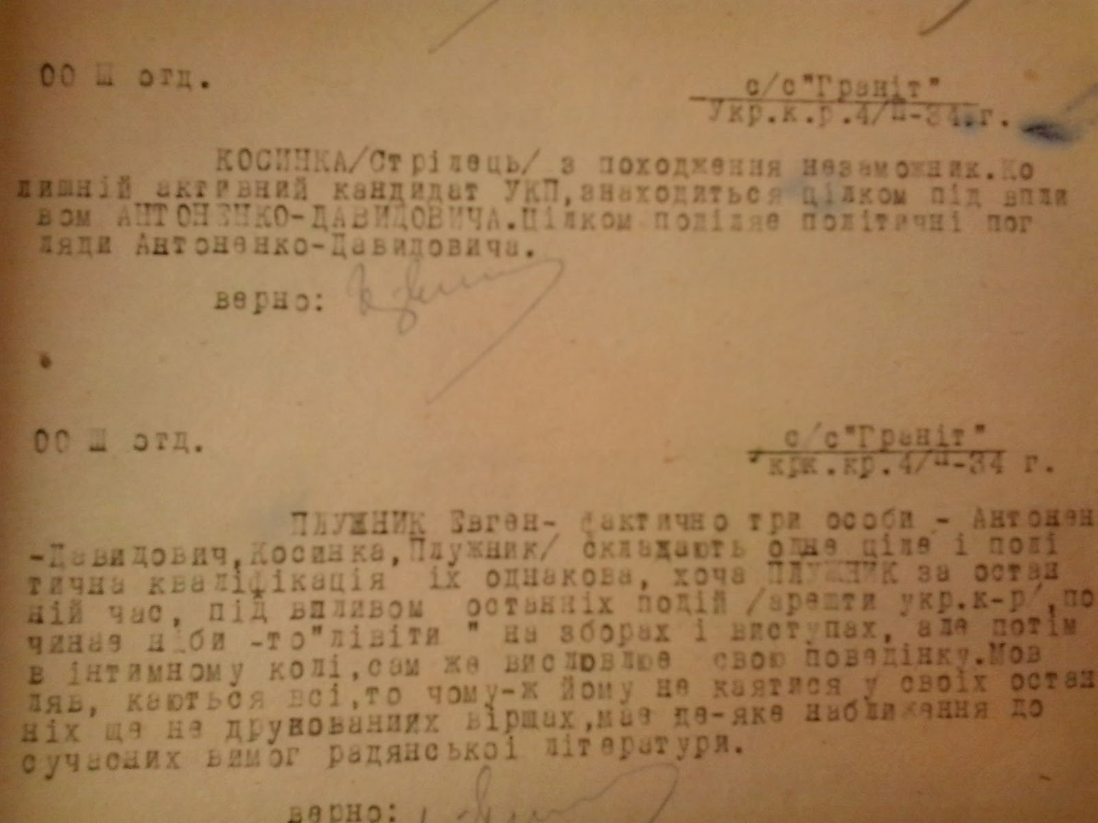 Они фактически руководят группой недовольных, направляют ее активность в ту или иную сторону, осторожно вербуют новых членов. К этой первой категории относятся следующие лица: Б.Антоненко-Давидович, Е.Плужник, М.Рыльский, Г.Косынка...».