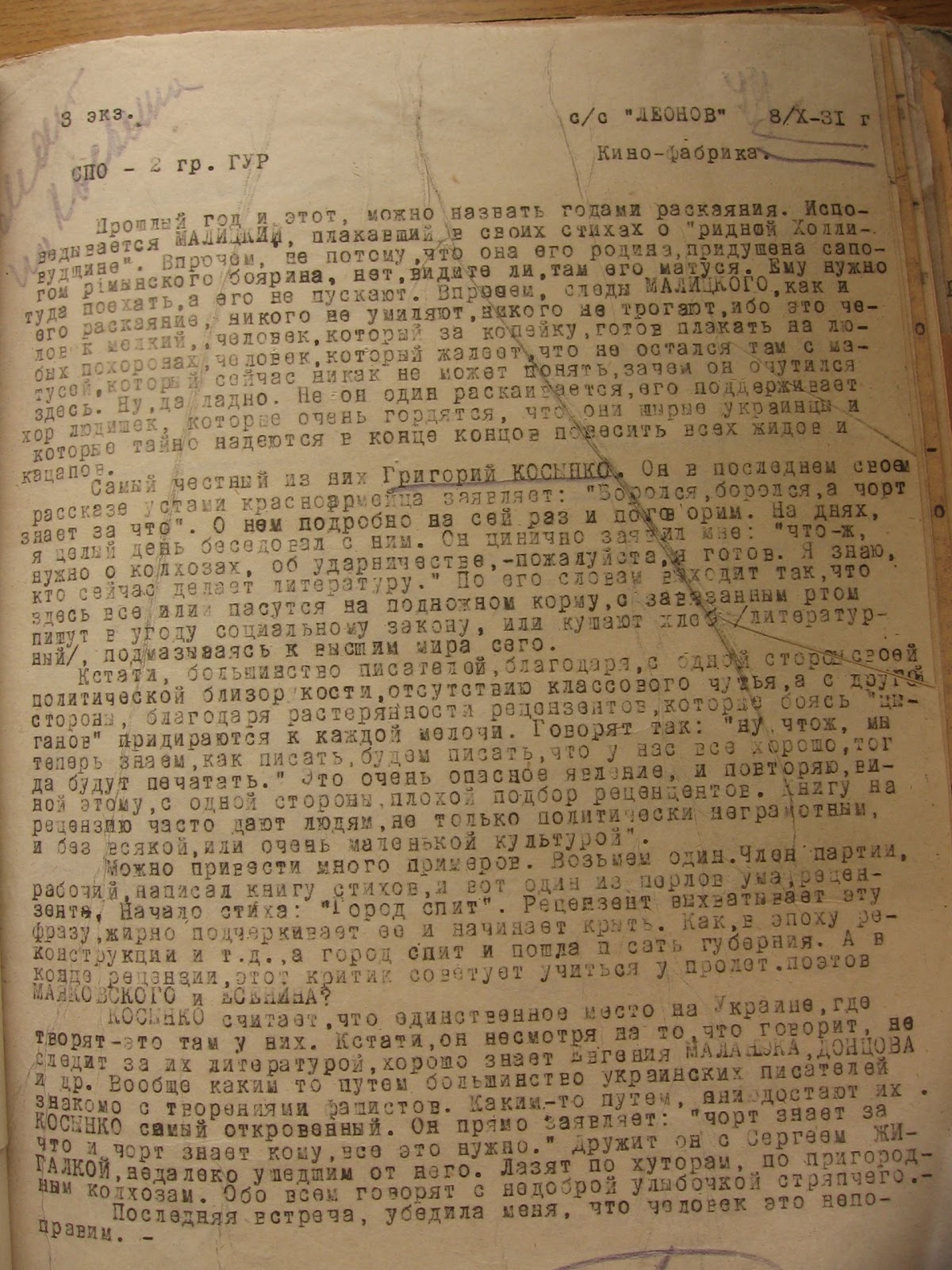 Из агентурного донесения с/с «Журналист». 3/II-34 г. «Среди писателей Киевского коллектива существует группа людей, объединяемых общностью политических взглядов и враждебным отношением к советской действительности. Все это большей частью ярые националисты, сходящиеся по-разному в одной точке зрения: «Москва угнетает Украину, только Европа сможет возродить Украину, этот богатейший край, стоящий в культурном отношении на неизмеримо высшем уровне, чем Россия.