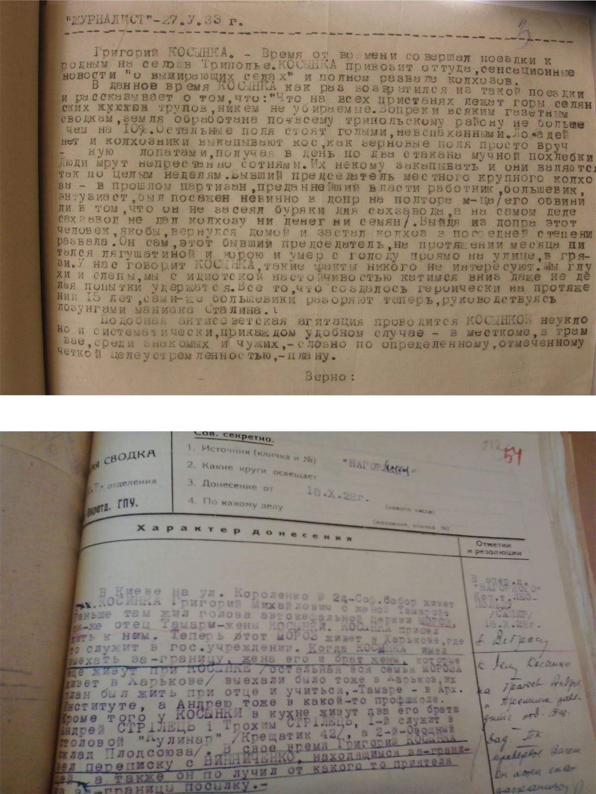 В отчете с/с «Журналист» говорится о перемещении Косынки: «Григорий Косынка время от времени совершал поездки к родным на село в Триполье. Косынка привозит оттуда сенсационные новости «о вымирающих селах» и полном развале колхозов. В данное время Косынка как раз возвратился из такой поездки и рассказывает о том, что «на всех пристанях лежат горы селянских трупов, никем не убираемые.