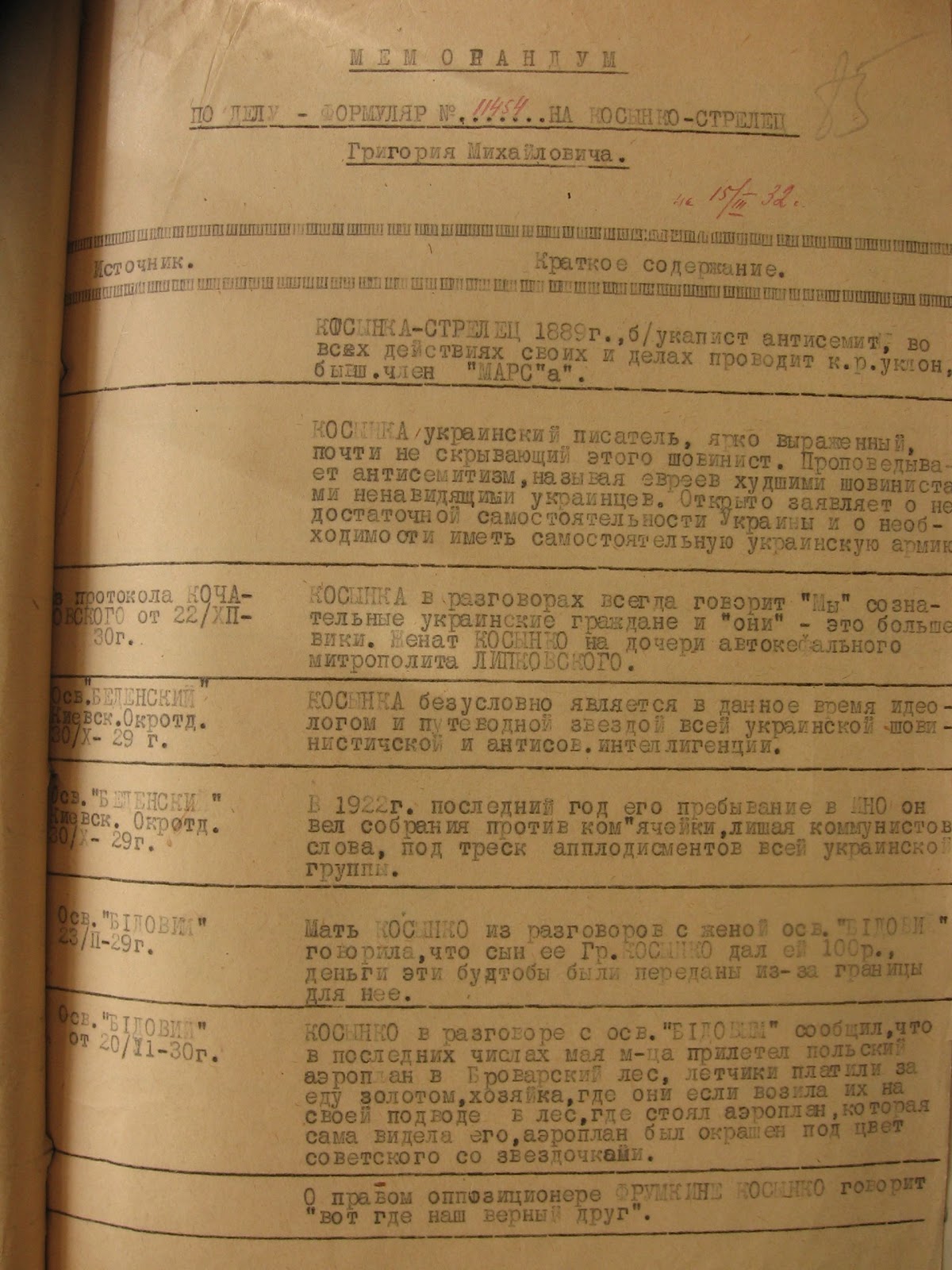 З меморандуму у справі-формуляр № 11454 на Косинко-Стрілець Григорія Михайловича, 15.03.1932 року:"Косынка украинский писатель, ярко выраженный, почти не скрывающий этого шовинист. Проповедует антисемитизм, называя евреев худшими шовинистами, ненавидящими украинцев. Открыто заявляет о недостаточной самостоятельности Украины и о необходимости иметь самостоятельную украинскую армию«.