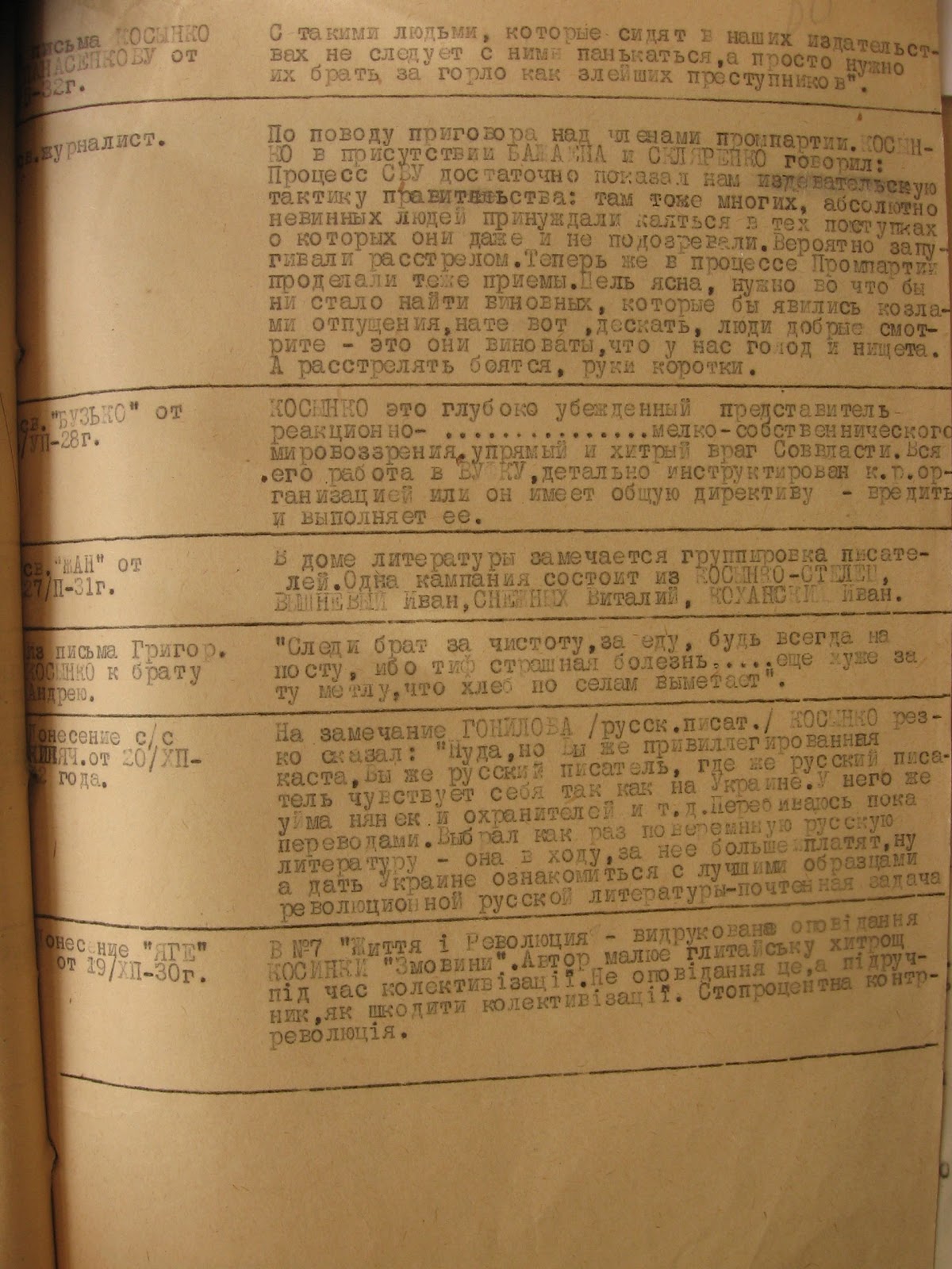 Из агентурного отчета, агент «Южный» от 26.И.1934 года: «Вечером 16 января заходил к Антоненко-Давидовичу. У него как раз собралась небольшая компания в составе Косынки, Сливинского и еще одного гражданина, приехавшего из Харькова. Беседовали об украинской литературе и литературе в условиях происходящих на Украине событий. Самые откровенные высказывания пренадлежали Косынке. [...]