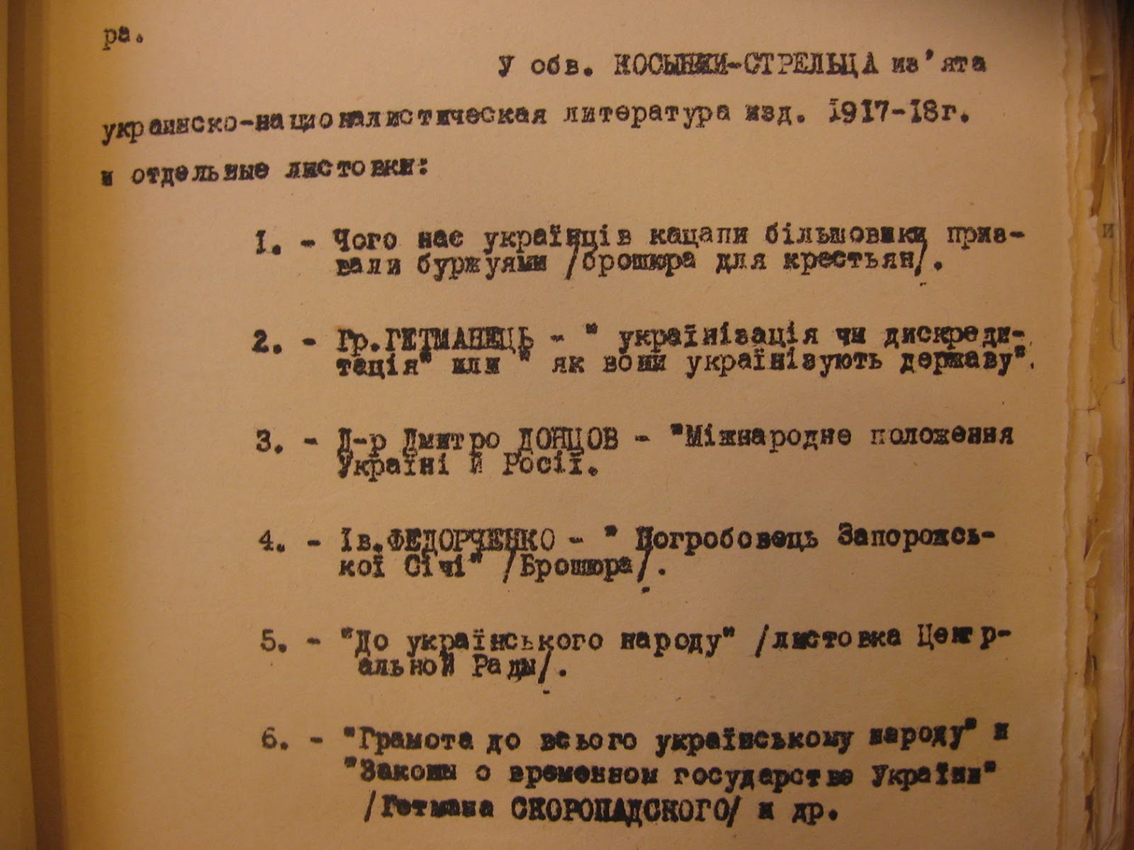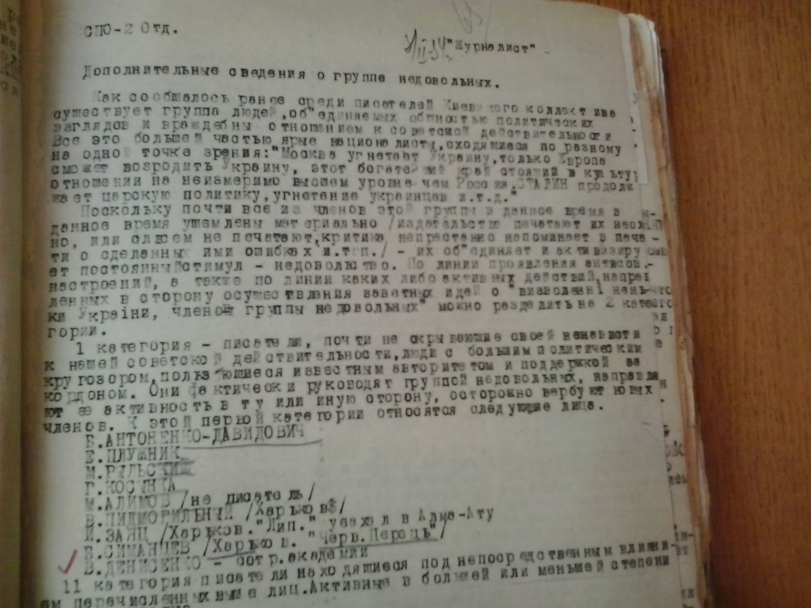 Сталин продолжает царскую политику, угнетение украинцев и т.д. [...] По линии проявления антисоветских настроений, а также по линии каких-либо активных действий, направленных в сторону осуществления заветных идей о „визволенні неньки України“, членов группы недовольных можно разделить на 2 категории. 1 категория — писатели, почти не скрывающие своей ненависти к нашей советской действительности, люди с большим политическим кругозором, пользующиеся известным авторитетом и поддержкой за кордоном.