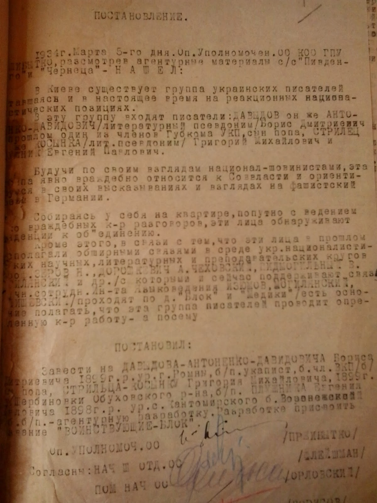 В связи с тем, что эти лица в прошлом располагали обширными связями в среде укр. националистических научных, литературных и преподавательских кругов, [...] есть основания полагать, что эта группа писателей проводит определенную к-р работу, а посему постановил: завести на Давыдова-Антоненко-Давидовича Бориса Дмитриевича 1899 г.р., Стрельца-Косынку Григория Михайловича 1899 г.р., Плужника Евгения Павловича 1898 г.р. агентурную разработку. Разработке присвоить название «ВОИНСТВУЮЩИЕ-БЛОК».
