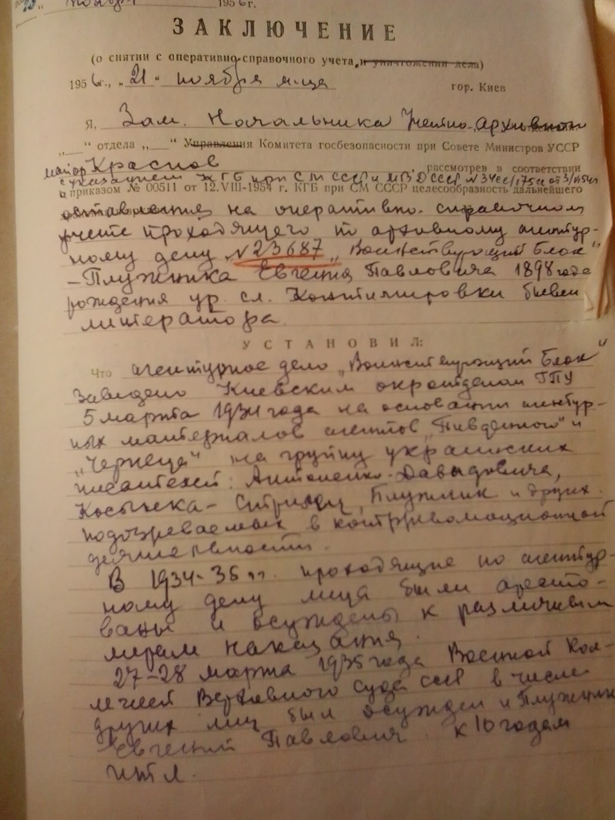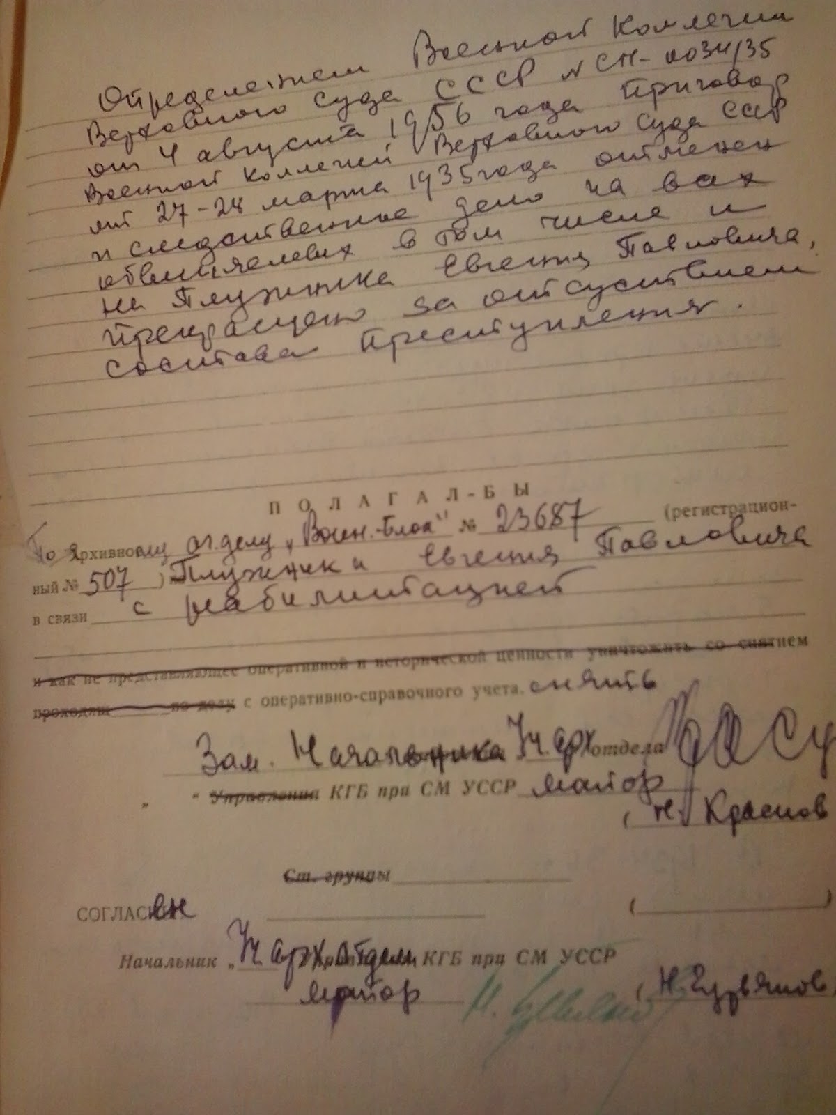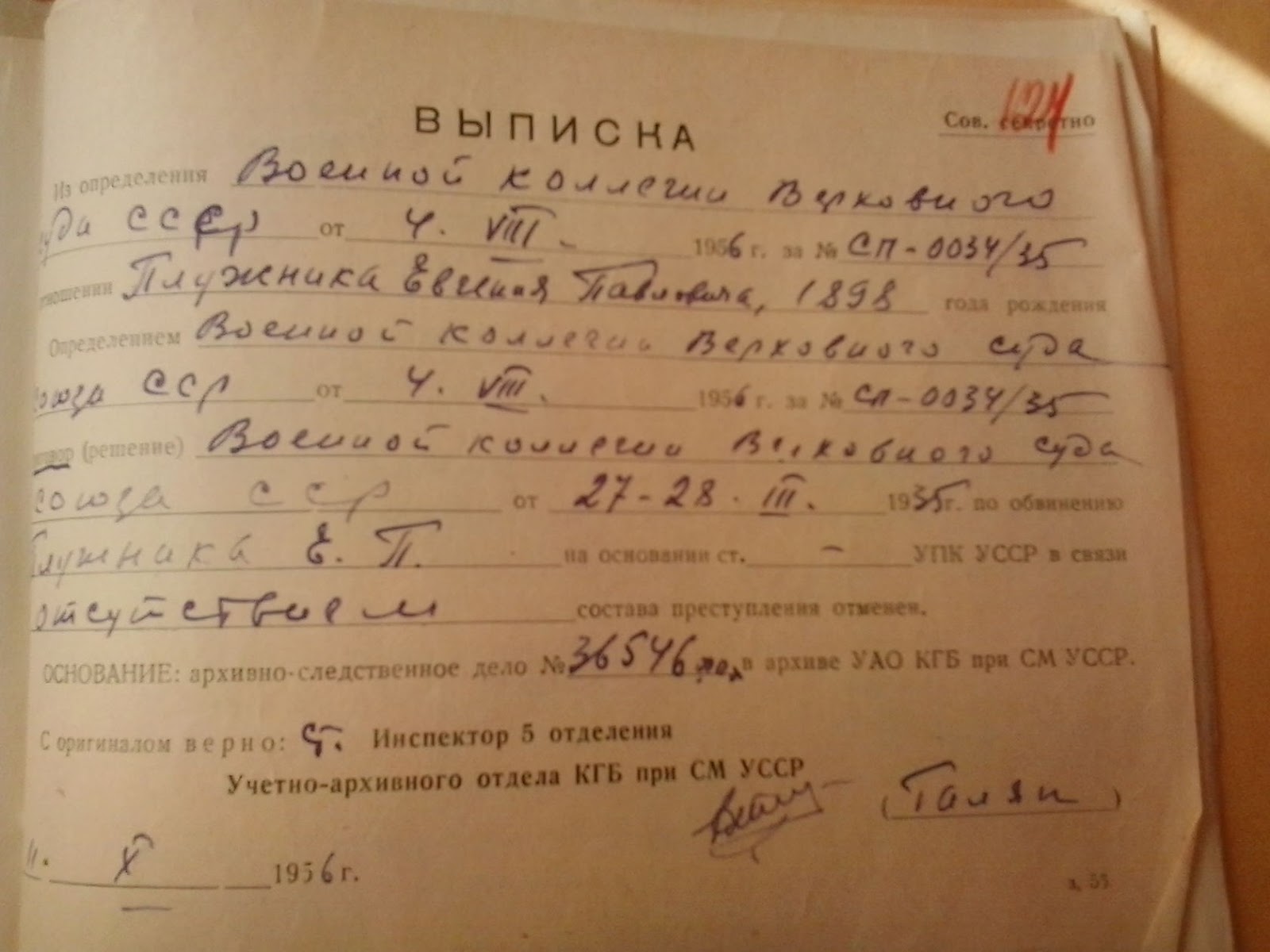 Вывод о снятии с оперативно-справочного учета и выписка Военной Коллегии о реабилитации: «В 1934-35 гг. проходящие по агентурному делу лица были арестованы и осуждены к различным мерам наказания. 27-28 марта 1935 года Военной коллегией Верховного Суда СССР в числе других лиц был осужден и Плужник Евгений Павлович к 10 годам ИТЛ. [...] 4 августа 1956 года приговор отменен и следственное дело на всех обвиняемых, в том числе и на Плужника Евгения Павловича, прекращено за отсутствием состава преступления».