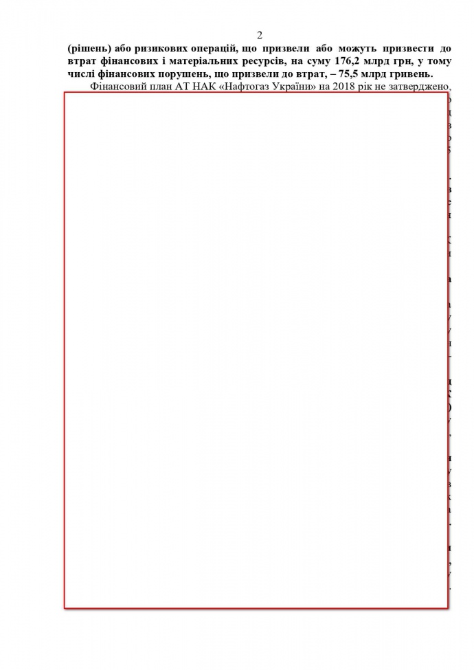 “Загалом ревізією “Нафтогазу” встановлено фінансових порушень та виявлено фактів неефективних управлінських дій або ризикових операцій, що призвели або можуть призвести до втрат фінансових і матеріальних ресурсів, на суму 176 млрд гривень, у тому числі фінансових порушень, що призвели до втрат у 75,5 млрд гривень“, – повідомляє керівника уряду Геннадій Пліс.