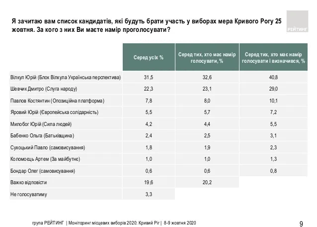 Среди кандидатов в мэры лидирует текущий глава города Юрий Вилкул: 40,8% среди тех, кто будет голосовать и определился с выбором. 29,0% готовы поддержать Дмитрия Шевчика (Слуга народа), 10,1% – Константина Павлова (ОПЗЖ), 7,2% – Юрия Ярового (Евросолидарность), 5,5% – Юрия Милобога (Сила людей). Не определились, за кого голосовать, около 20% опрошенных.