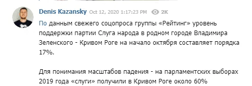 Об этом говорят данные соцопроса группы "Рейтинг", который был проведен 8-9 октября. Журналист Денис Казанский отметил, что на парламентских выборах 2019 года "слуги" получили в Кривом Роге около 60% голосов.