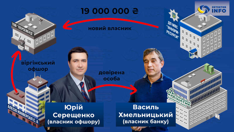Из открытых реестров следует, что эта фирма оформлена на виргинскую офшорку "Алессио Юниверсал С.А.", которой владеет одессит Юрий Серещенко. Последний - экс-член наблюдательного совета банка "Хрещатик" и доверенное лицо экс-владельца финучреждения, бизнесмена Василия Хмельницкого. А уже Хмельницкий - мажоритарный акционер украинской строительной группы UDP, которая сводит квартал элитной столичной недвижимости "Новопечерские липки", который расположен вплотную с проданными зданиями ГП МВД "Информ-ресурсы».