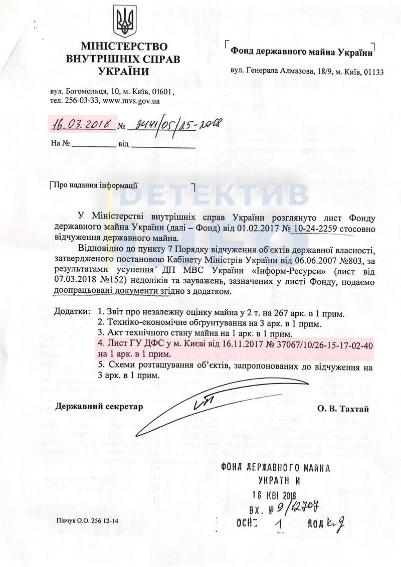 Соответствующее представление направил в ФГИУ бывший заместитель министра, а ныне - государственный секретарь МВД Алексей Тахтай еще в марте 2018 года. В сопровождающих документах - оценка имущества "Информ-Ресурсов", акты, схемы, а главное - письмо от ГУ ДФС в Киеве.