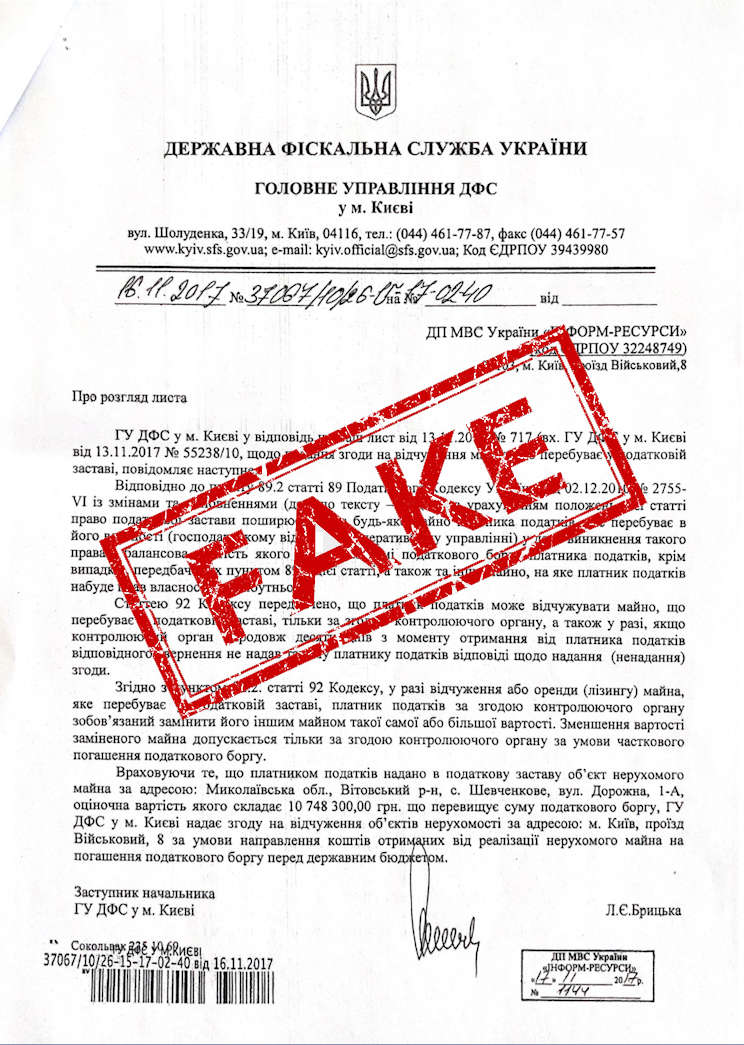 налогоплательщиком предоставлено в залог объект недвижимого имущества в Николаевской области ". А ниже - стоит подпись заместителя начальника ГУ ДФС в Киеве Леси Брицкой.