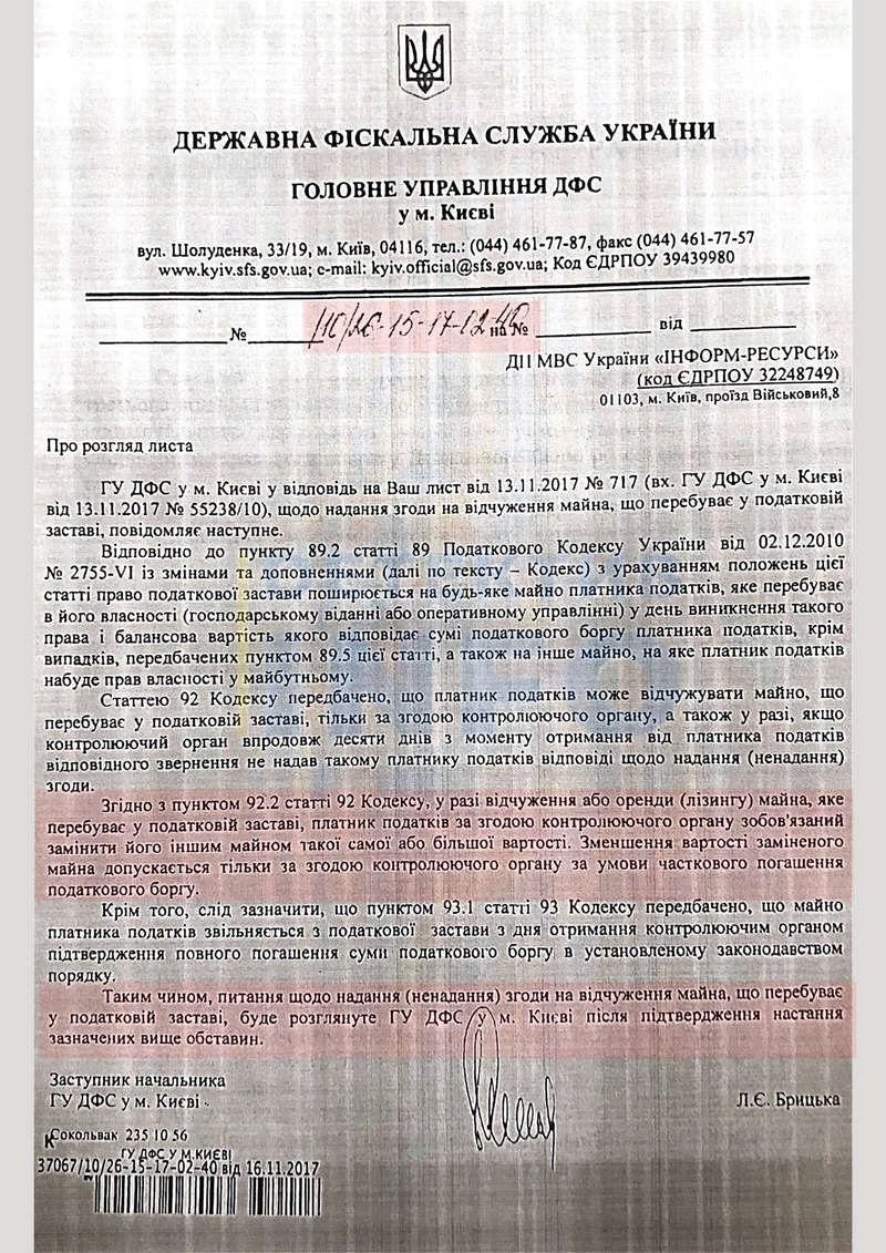 В нем указано, что фискалы "предоставляют согласие на продажу госнедвижимости по адресу г. Киев, Военный проезд, 8", которая находилась в налоговом залоге, учитывая то, что