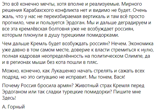 "Это все конечно мечты, хотя вполне и реализуемые. Мирного решения карабахского конфликта нет и видимо не будет. Очень жаль, что у нас не переизбираемая вертикаль и там все просто прогнило, чем и пользуется Эрдоган. Мы и дальше деградируем и все эта кремлевская болтовня уже не возбуждает россиян, которым плюнули в душу турецкими помидорками", – отметил блогер.